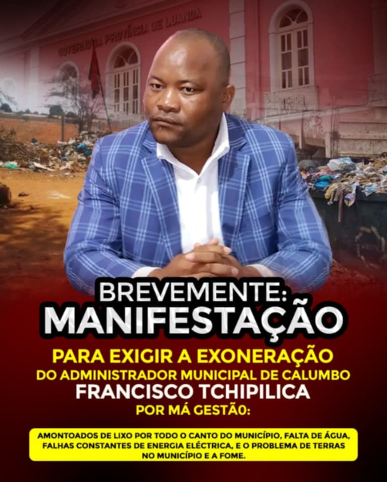 Um grupo da Sociedade Civil, no município do Calumbo, prometem, sacudir em breve as ruas, para exigir exoneração do actual administrador municipal, Francisco Tchipilica, face a má gestão.