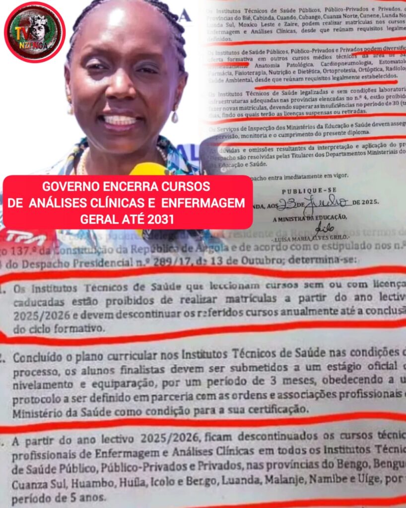 Os Ministérios da Saúde e Educação em documento posto a circular, dão conta do encerramento dos cursos de análises clínicas e enfermagem geral nos Institutos Técnicos de Saúde Público e Privado, em 11 províncias do país, num período de 5 anos.