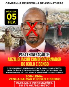 Os populares da Província de Icolo e Bengo, começam a 05 do mês corrente, um processo de recolha de assinaturas para exigir a exoneração imediata do Governador Auzílio Jacob, sob pretexto de salvar a Província do estado de governação que se encontra com a actual gestão.