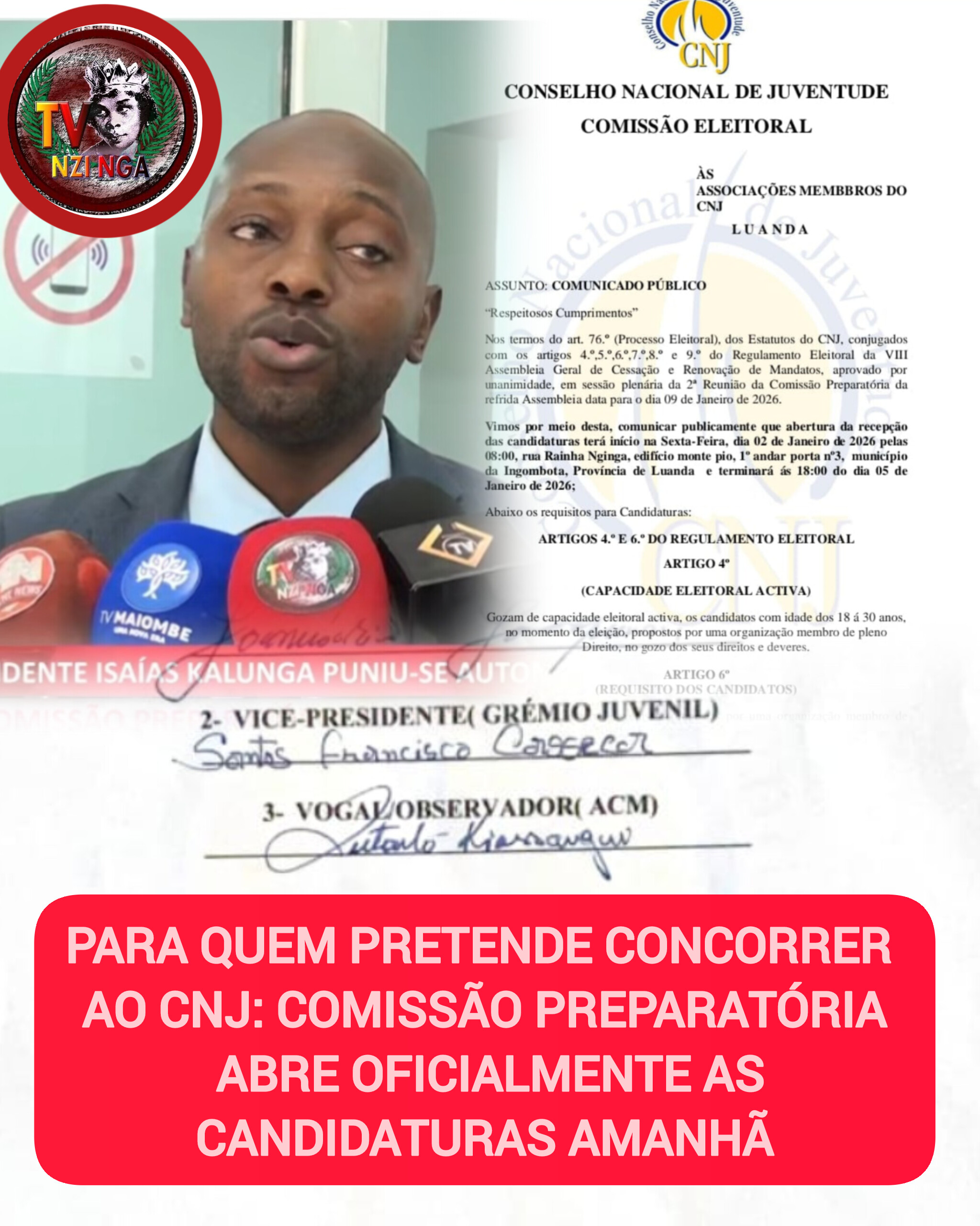Nos termos do art. 76.º (Processo Eleitoral), dos Estatutos do CNJ, conjugados com os artigos 4.º,5.º,6.º,7.º,8.º e 9.º do Regulamento Eleitoral da VIII Assembleia Geral de Cessação e Renovação de Mandatos, aprovado por unanimidade, em sessão plenária da 2ª Reunião da Comissão Preparatória da refrida Assembleia data para o dia 09 de Janeiro de 2026.