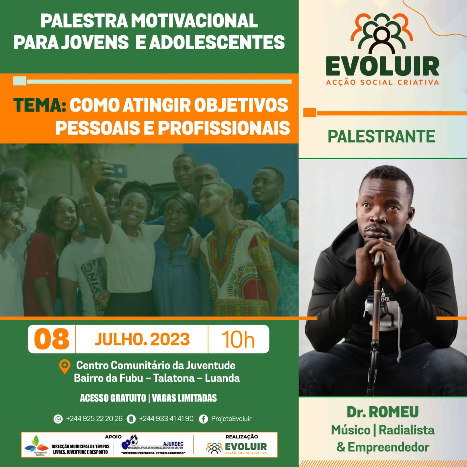 Projeto EVOLUIR, realiza, uma palestra motivacional, no dia 18 de Julho, Palestra Motivacional para Jovens Adolescentes, com tema: Como Atingir Objetivos Pessoais e Profissionais, no Centro Comunitário da Juventude, Bairro da Fubu.
